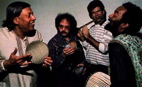 Seated on the floor, in a circle, were six men all dressed in white. In the center of the circle was a robust middle-aged man, his feet tucked under his dhoti, his lips red from the betel-nut he was chewing. A cup of tea was at his side and a harmonium and flute case lay on the floor before him. This was the teacher I had heard so much about.